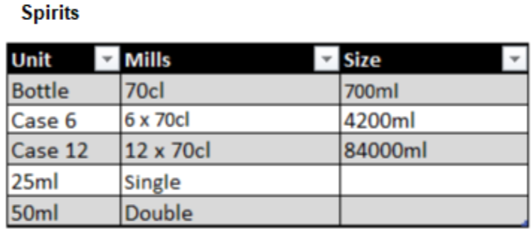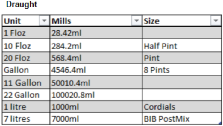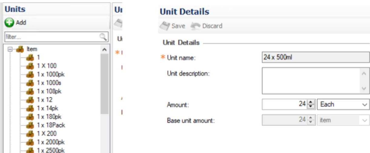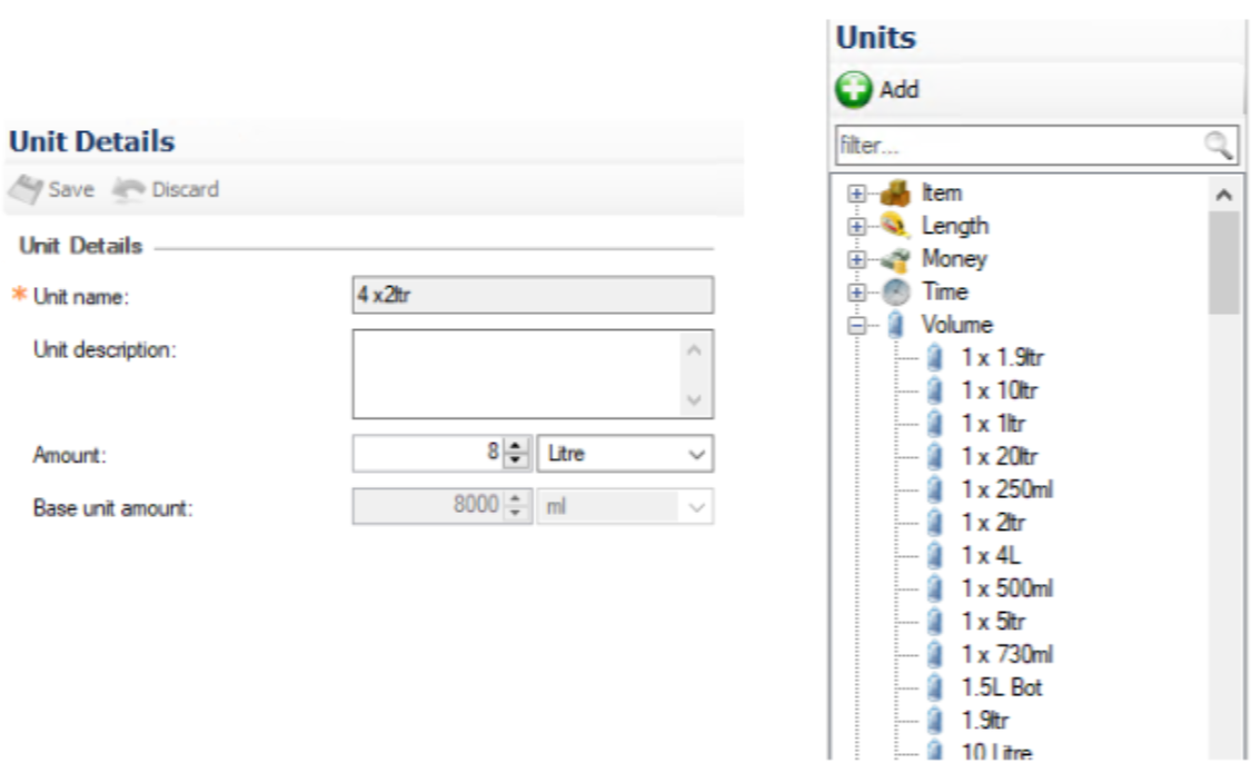 Units are used when setting up products to determine the sizes that they are purchased in, counted in or used within recipes. The most common types of unit used are volume, weight and items.