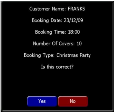 8. The booking confirmation details screen is then displayed; press the Yes button to confirm the details.
