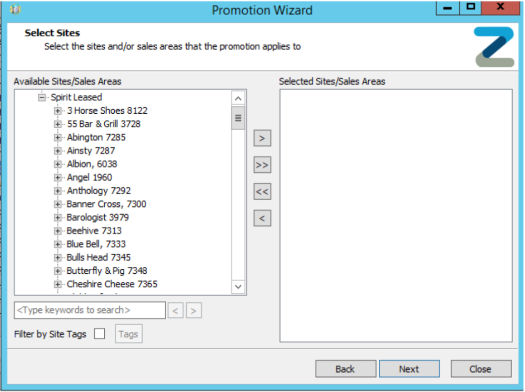 To remove a site select it in the Site/Sales Area by highlighting the site and selecting the left arrow button