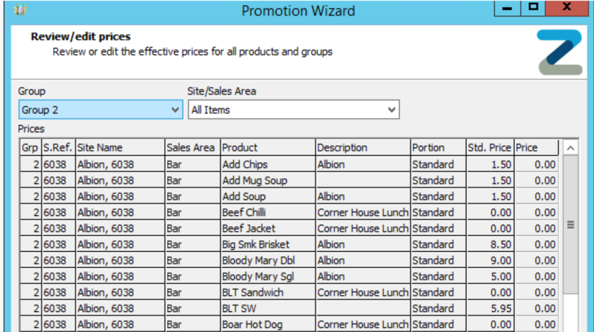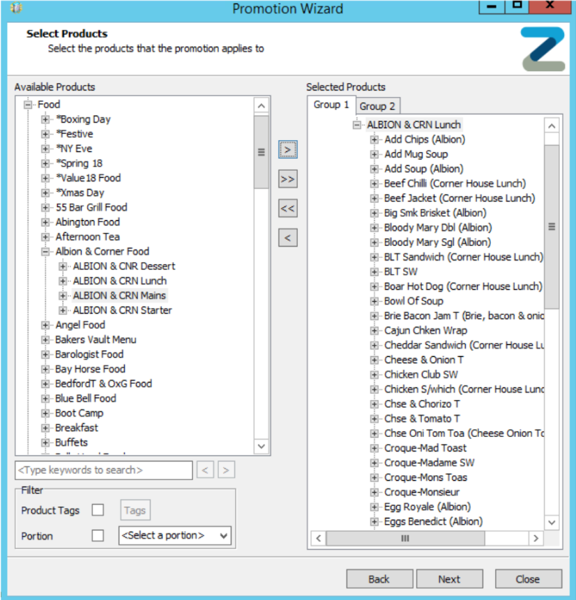 - Enter the products into the groups that are included in the promotion, e.g. in this example we are doing a BOGOF on Lunch, so Group 1 and Group 2 both contain lunch products.