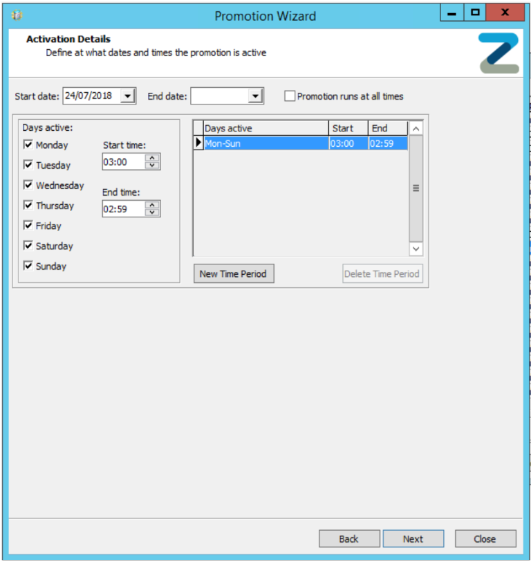 Group 1 will be charged as normal, and group 2 will be set to decrease value by 100% (free product) - Next, you can set the specific days and times during which the promotion is active, or select the box for the promotion to run all the time.