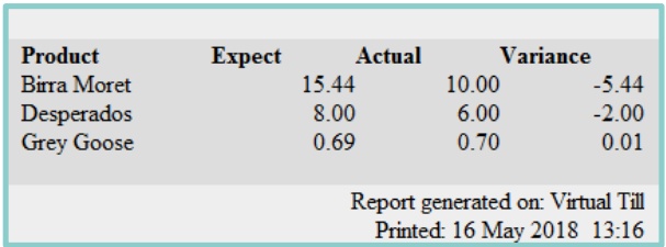 8. The spot check report will display the expected, actual and variance figures for each product.