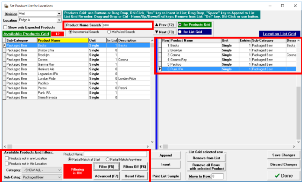 8. Use the Product Name Search function or the Grid Filters at the bottom of the screen, remembering to select Filter On to locate the product required.