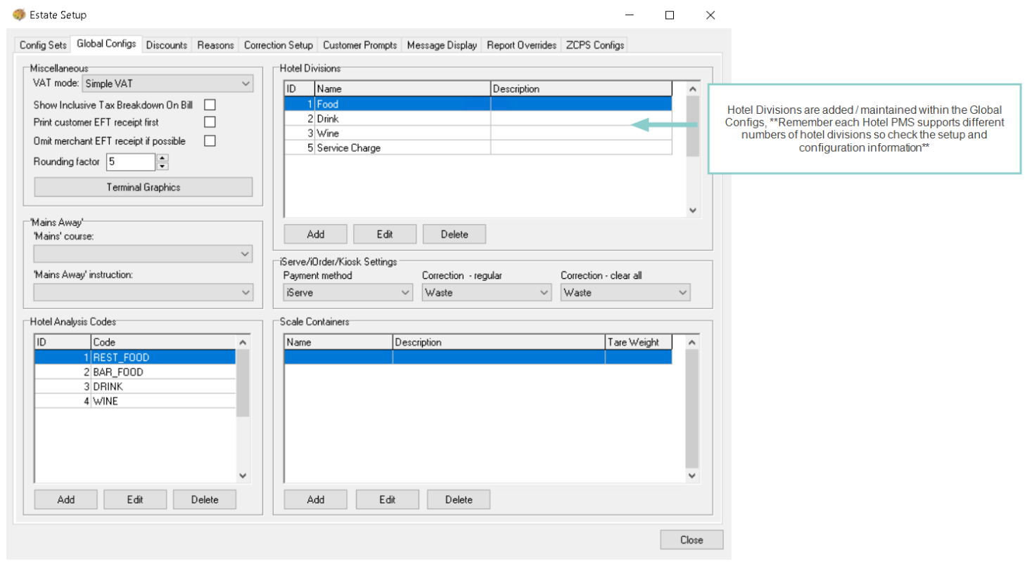 Hotel PMS Interfaces: when used for PMS interfaces hotel divisions are assigned to product sub-categories so that revenue can be grouped by division when sent to the property management system.