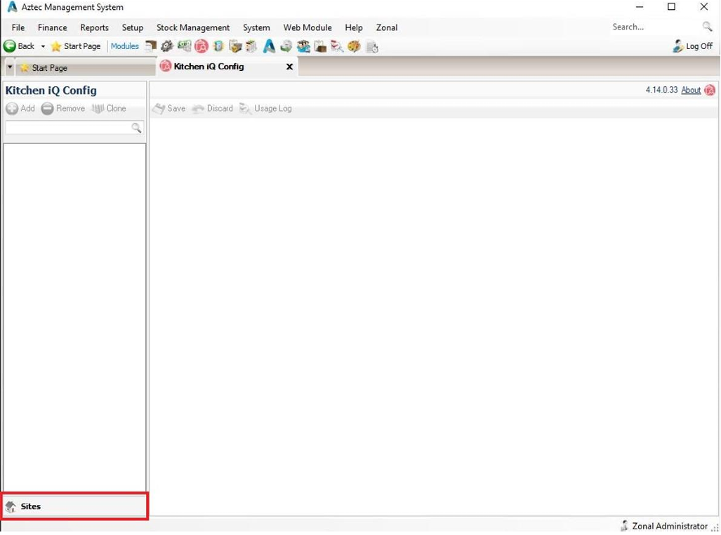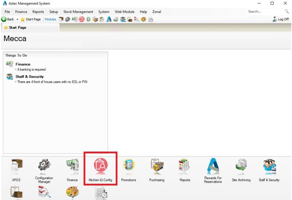 1. Log into the Aztec shell and navigate to the Kitchen iQ Config module.