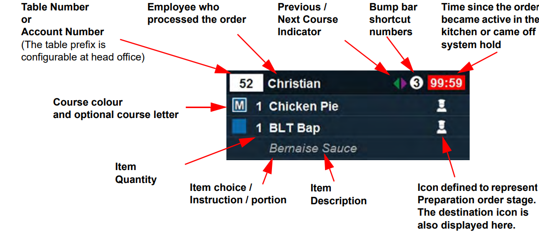 Customer orders are displayed in the kitchen using a standard format. This format contains key information for kitchen and wait staff.