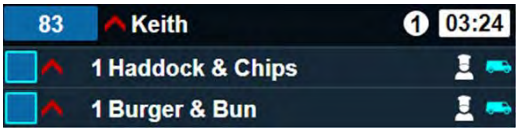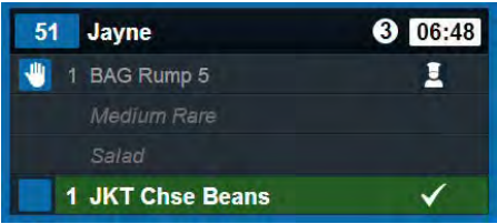 In the example below, the "JKT Chse Beans" item is highlighted in green with a tick icon, signifying that the item is ready to serve. - If configured, order lines that contain specific text can be highlighted and/or prioritised automatically.
