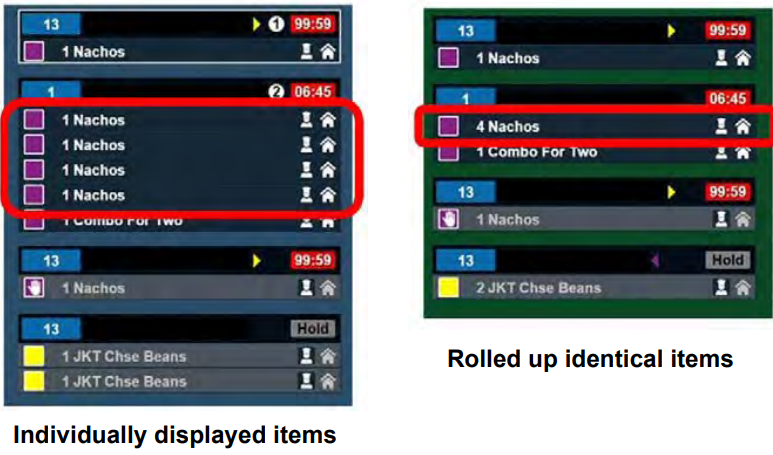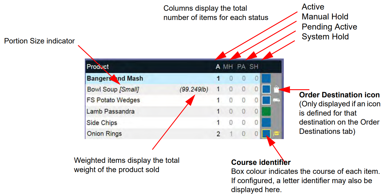 Tickets are displayed in the order they were rung up with the course icon displayed alongside each item in the order. Items that are active, on manual hold or on system hold are not differentiated.