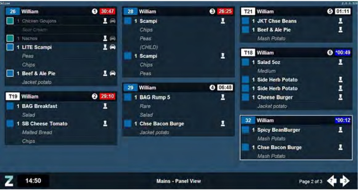 If there are too many orders to display on one page, an indicator is displayed in the bottom right-hand corner of the page to indicate how many orders (Panel and Order Ticket view), items (Item, Count and Cook Times view) or tables (Table view) are displayed on the following or preceding pages.