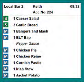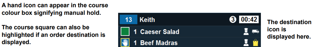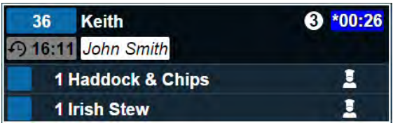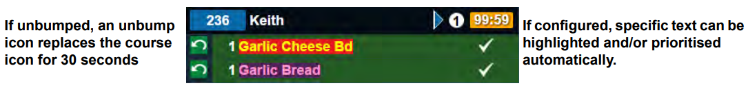 The item name can also be configured to be displayed in the course colour at head office as shown in the example below: - If the item is unbumped, the course colour box is replaced with an unbump icon for 30 seconds to highlight users to this change. The icon on the right-hand side makes it easy to identify the order stage of each item, and is configurable at head office.