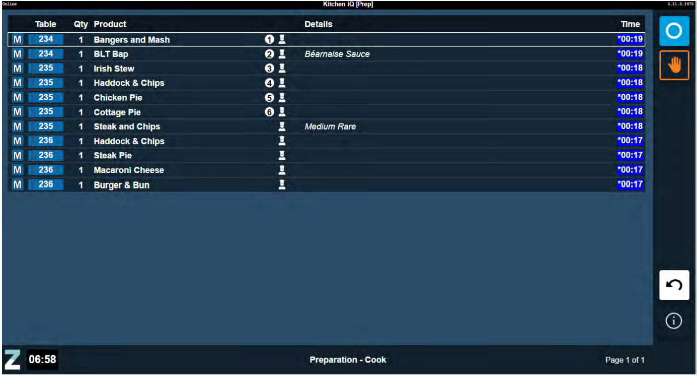 The Cook Times View displays items in order of cook times, so the items that take the longest to cook are displayed first. This makes it easier for chefs to co-ordinate dishes so that all items in an order can be ready at the same time.