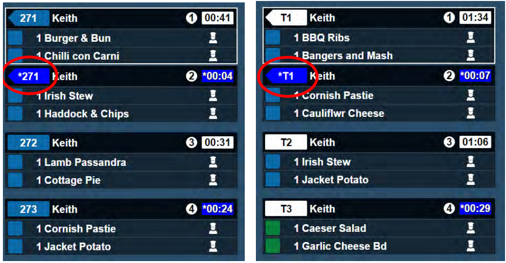 When table or account numbers are grouped, the indicator becomes pointed on the left-hand side and when the timer displays the ‘new item blue’, the table number displays an asterisk (*) before the number and flashes blue.