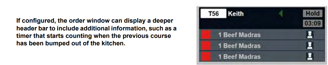 If the pending active timer is activated for your site, a timer will be displayed under the Hold label which will count up from the time that the previous course was bumped out of the kitchen.