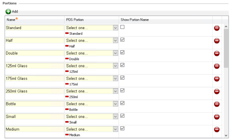 Portions are used on the POS to control the sale of products that have different sizes or alternate ways of being sold, for example Small, Medium, Stuffed Crust, Take Away etc.