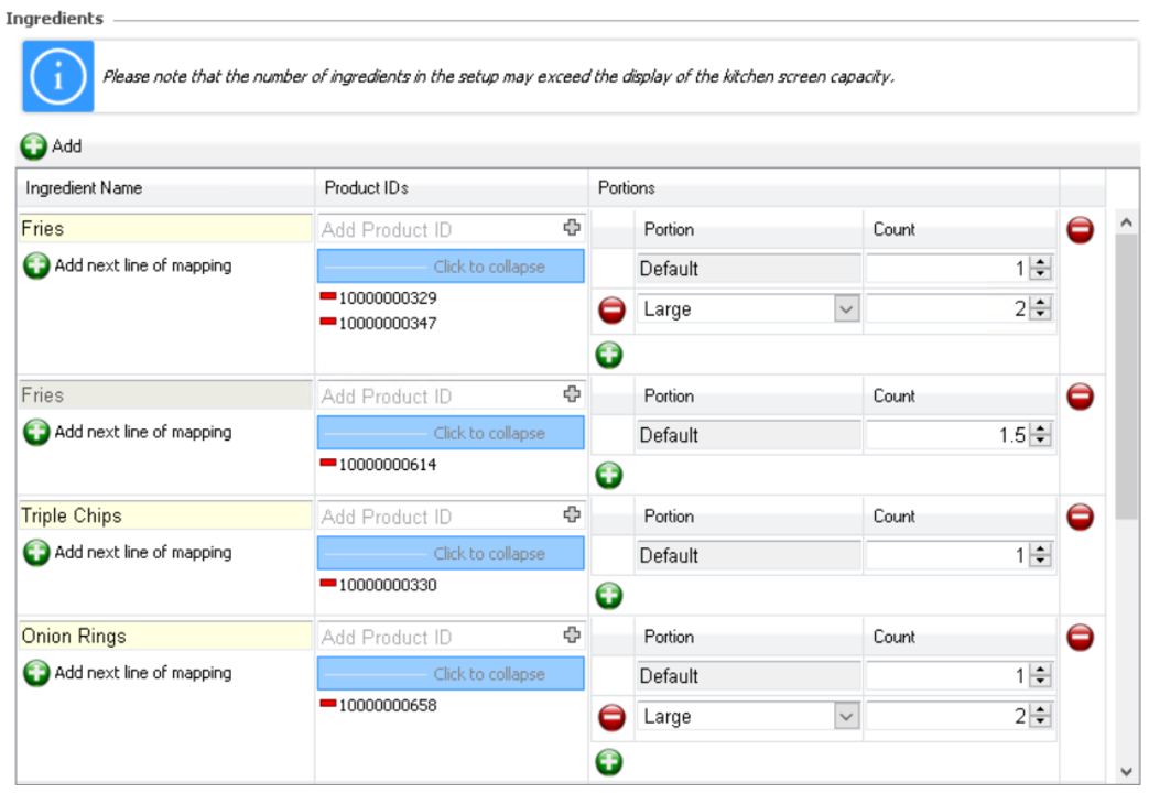 Don't forget you can map any product for example you might have 8oz Sirloin steak that comes with Fries and Onion Rings so the ID for the steak can be added within the ingredient mapping as well as products that might be a side order like fries