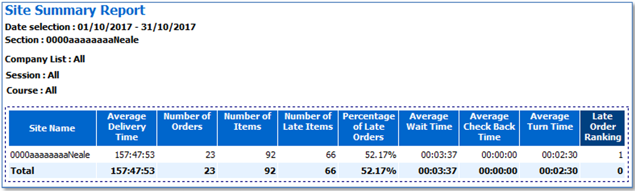 • Site Summary report - The Site Summary Report can be viewed at Head Office to review and compare performance between sites.