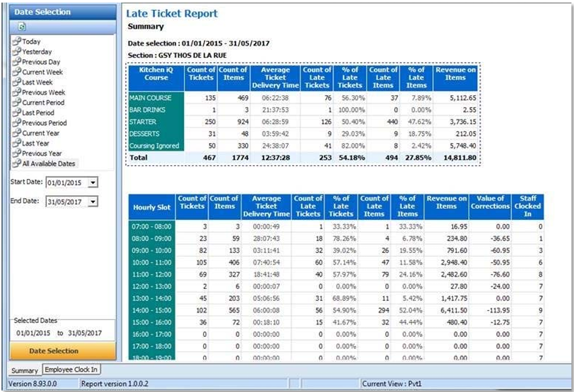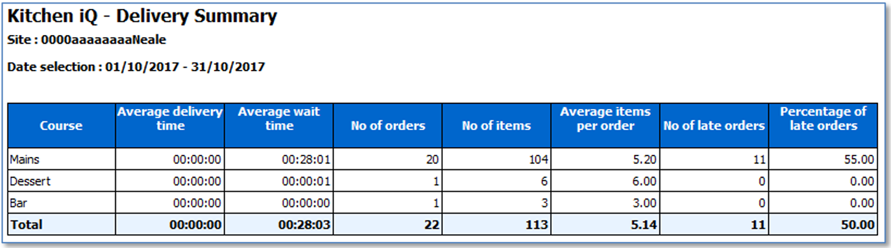 The Delivery Summary report shows delivery time performance to give an overview of timings per course, and timings overall for the journey through the kitchen.