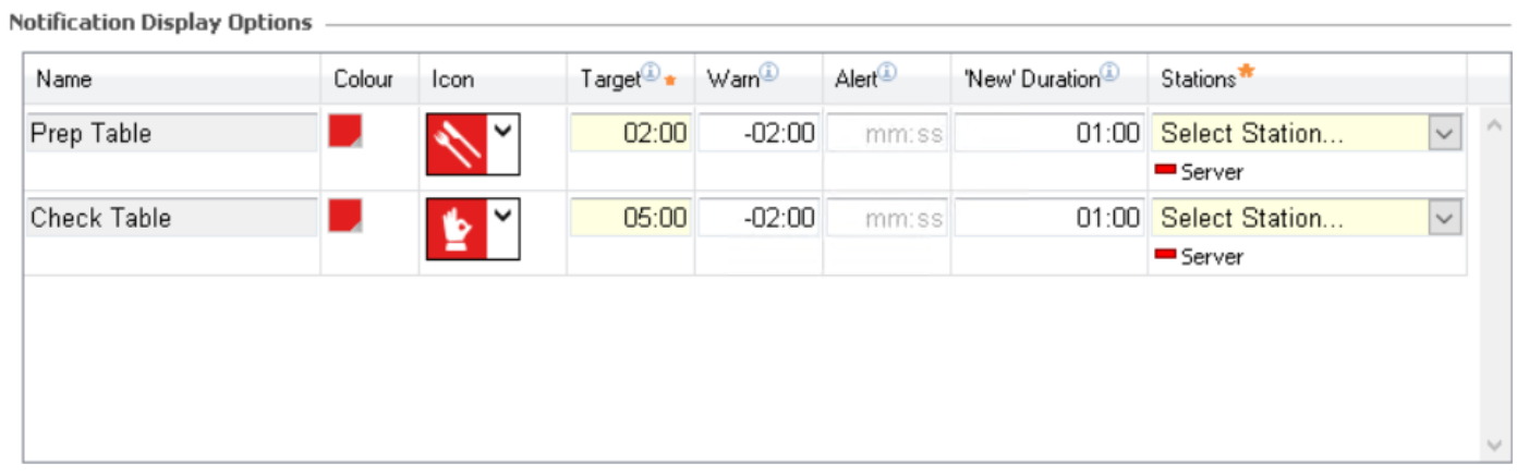 | Warn | Entry box to define the notification warn time in MM:SS (displayed in amber) when the notification is approaching the target time |
