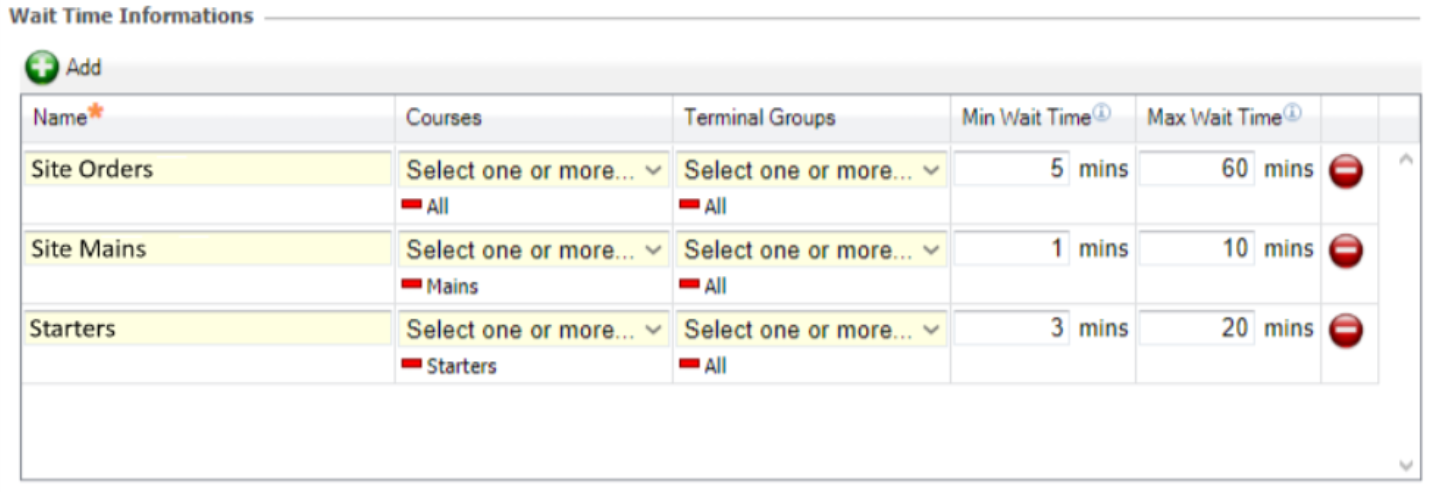 Wait Time Information allows staff on site to understand the estimated number of minutes remaining before an order is ready. Once configured, this feature automatically calculates the estimated Wait Time Information by analysing current Kitchen iQ activity and all active orders at a particular site. To return more specific Wait Time Information results, multiple calculations can be configured with different times based on specific Course or Terminal Group filters. This gives sites the ability to calculate Wait Times for a certain type of order and area on site (eg: drinks vs food, bar vs restaurant).