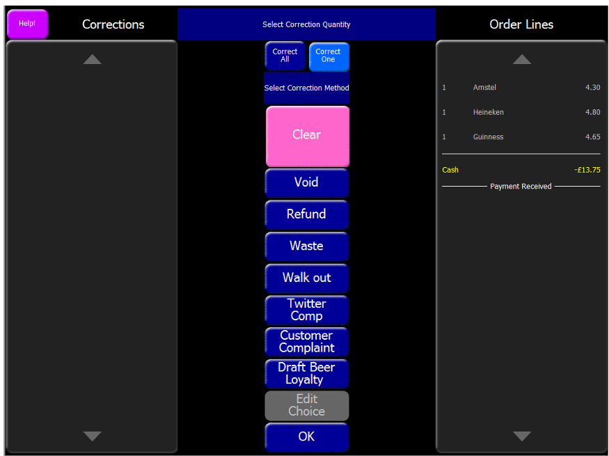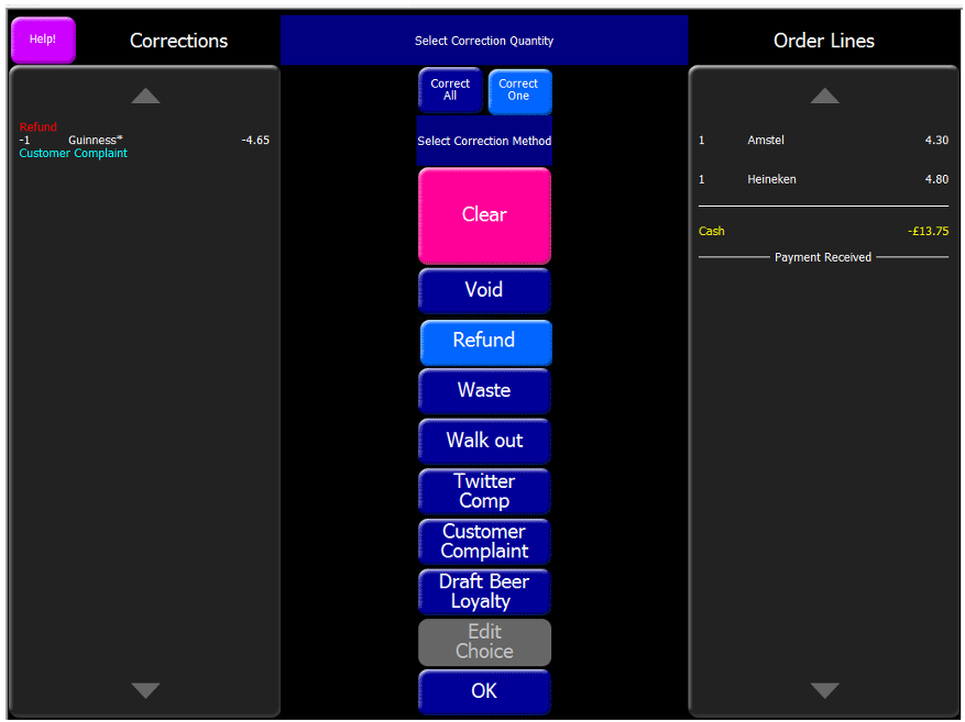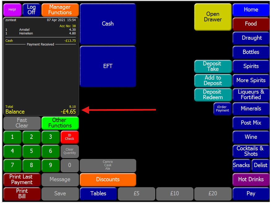 13. On the order pad on the Theme, you will see a negative amount. This amount is the price of the Guinness that is too expected to be paid back to the customer.