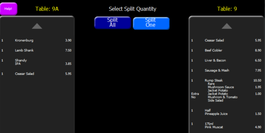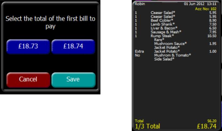 In addition if the bill cannot be split equally, the PoS will show the screen select the total of the first bill to pay screen, allowing the higher or lower amount (by 1p) to be selected.
