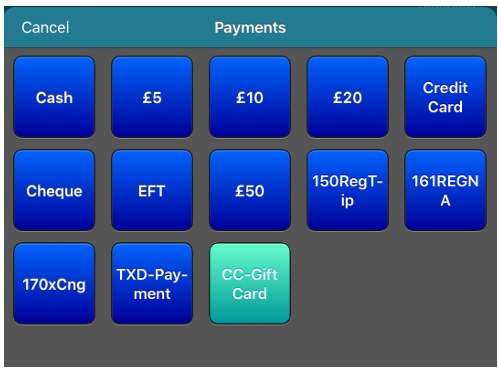 Any payment method that has a button on the theme will appear in this screen, but only those card payment options that are enabled for use are displayed.