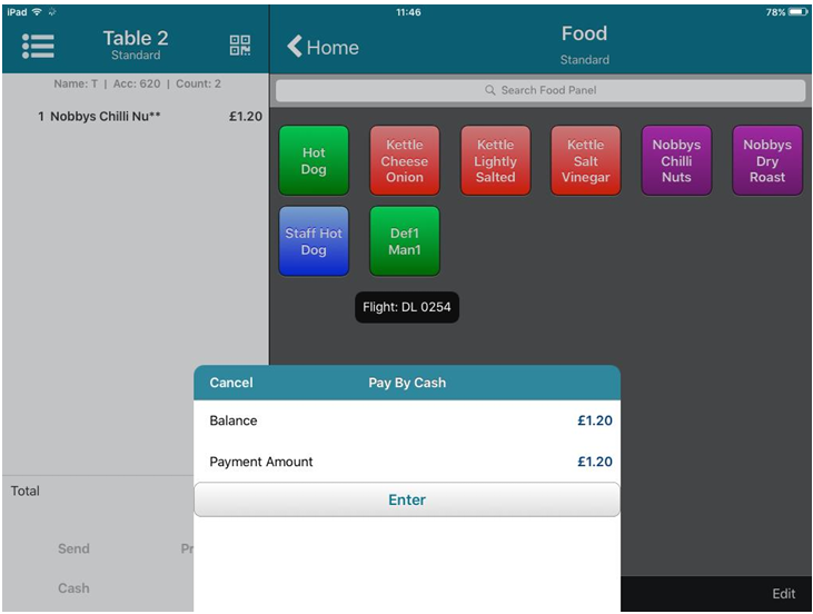 Select Cash to pay by cash or Pay to open the Pay screen to access other payment methods set up in Theme Modelling.