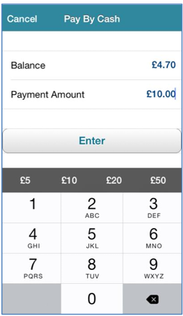 Cash payments can be enabled or disabled in the iServe Config Server. If disabled, the Cash option will be greyed out. The cash button will also be greyed out if the user’s default role does not have access to the cash payment button (does not apply to non-cash payments)