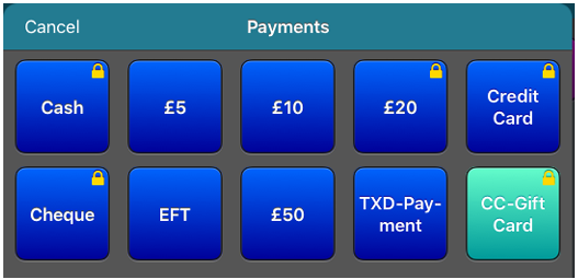 If access to payment buttons has been restricted by button security, a padlock will be displayed in the top right of the payment button. Button security is defined in Aztec Staff and Security at head office.