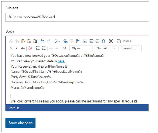 Here, you can edit both the Subject and Body of the e-mails as per your requirements, including use of the dynamic fields which will pull data to personalise the e-mail (see below example).