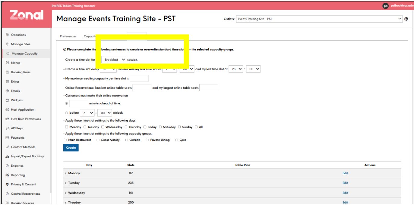 In the Capacity section, enter the Maximum Seating Capacity for this time slot. This is the total number of covers that can be booked.