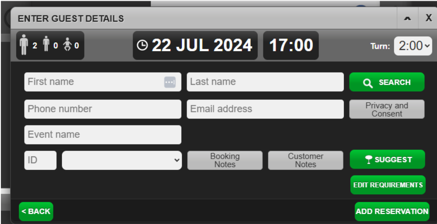 - Enter the party size, estimated turn time, and optionally set a wait time.