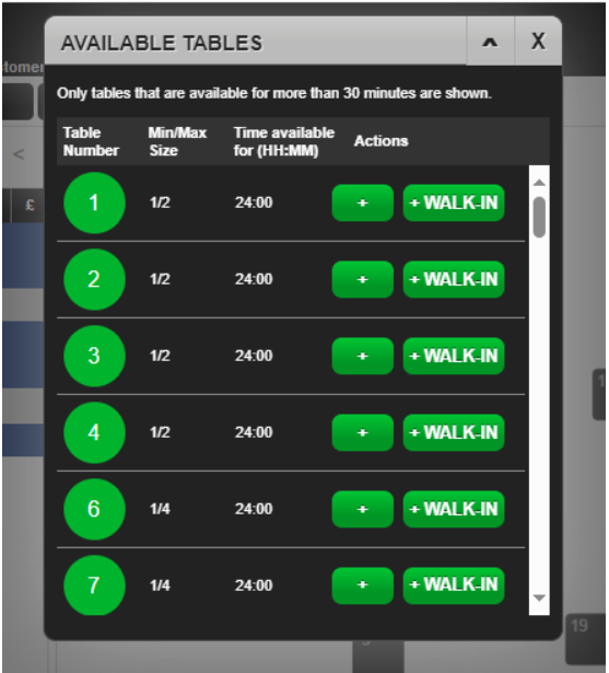 Select the Available Tables icon to display a list of all the tables that are both available now and those that will become free within the next 30 minutes :