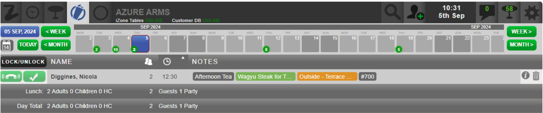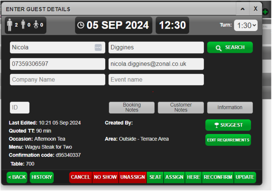 7. Once any changes have been made, select Update. The reservation will then re-allocate to a different table if the covers have been amended.