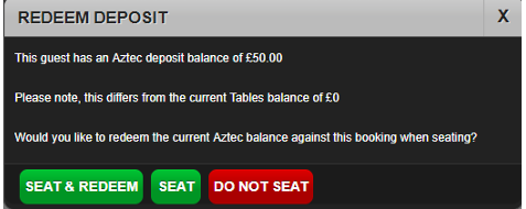6. If a deposit has been taken for the guest, you will be prompted to Seat and redeem the deposit or seat without redeeming the deposit.