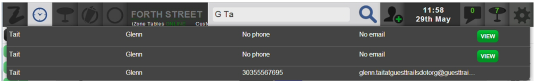 The search facility includes a fuzzy search on both the surname and the forename, so you can still search for a customer if you can only remember part of a name. For example, if you enter G as the first initial followed by Ta, all customers in the database with ‘G’ as a first initial and ‘Ta’ anywhere in their surname will be displayed.