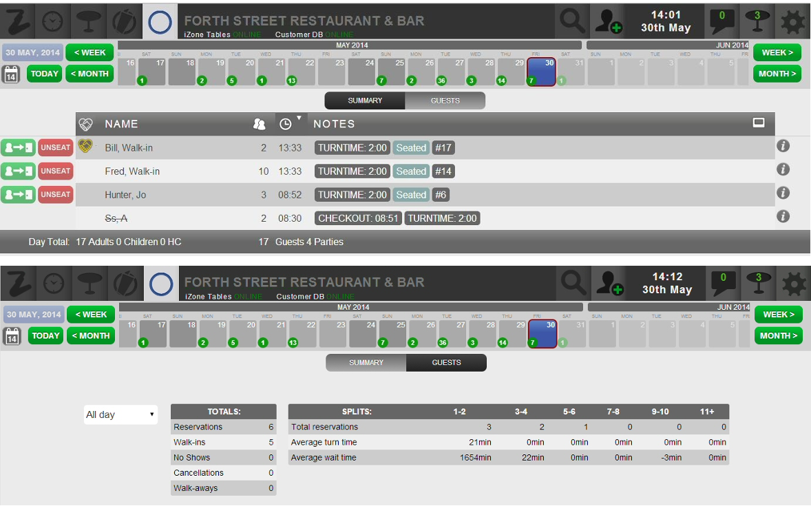 When an alert condition has been met, alerts will be displayed in the appropriate customer’s row. The table number and turnaround time is shown, and users can switch between Guest and Summary views as shown below: