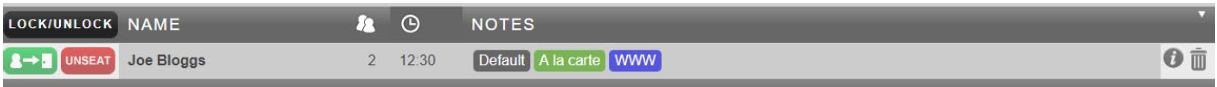 The Seated tab provides summary information about all customers served in your restaurant during the current session for the past 24 hours. For customers that are still seated, users have the option to unseat them or mark them as having left the site, either marking the table as dirty (Bus) or cleared.