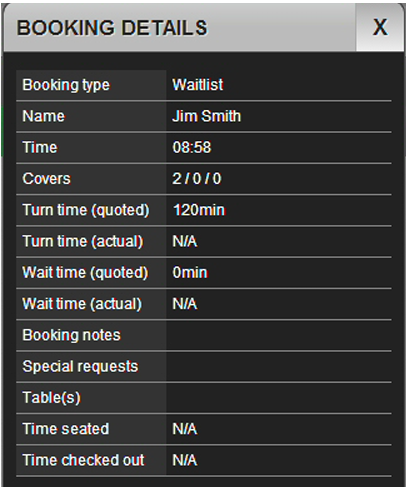 If you need more information about the customer, for example because they left their phone or wallet at the table, select the information icon alongside the customer to display all available details in the Booking Details window.