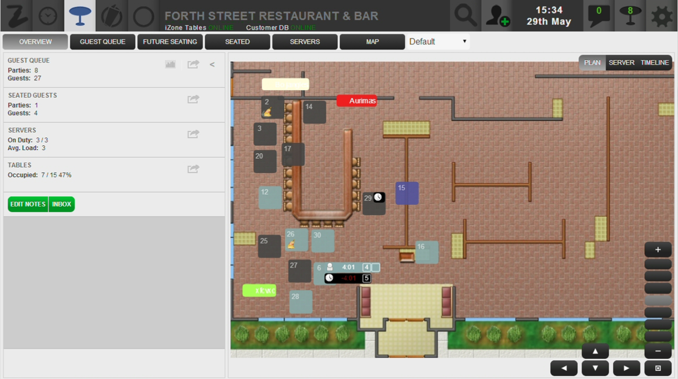 Each table also has data attached to it, such as how long a party has been seated, whether or not the table is blocked so customers cannot be seated, and whether the table needs to be cleaned / bussed.