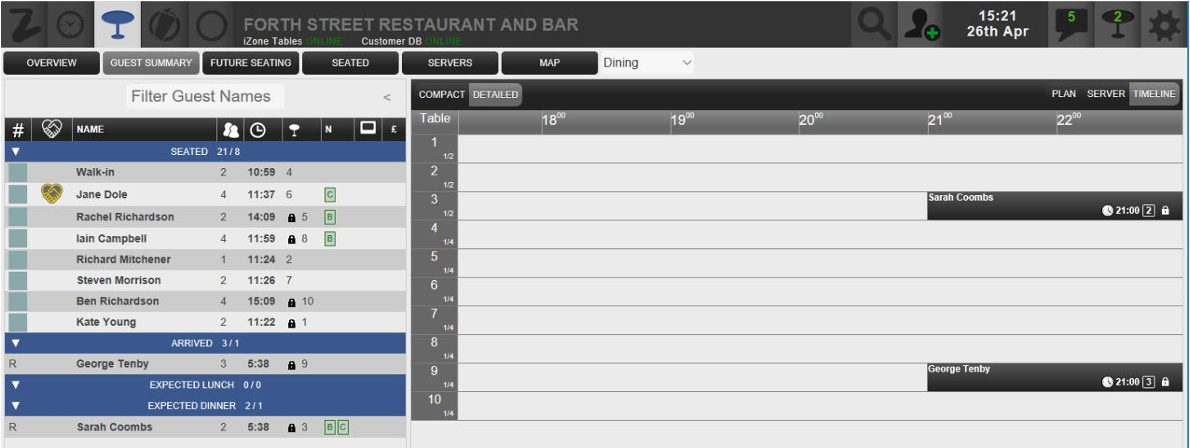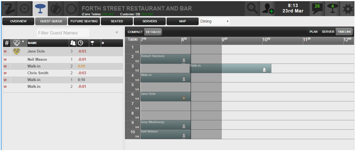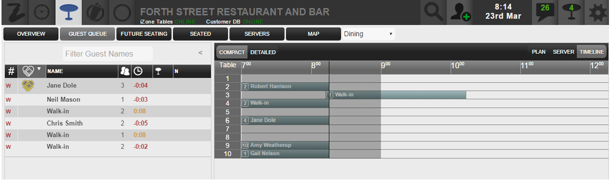 An alternative compact view is available that just displays the customer’s name and table number. Users can toggle between the compact and detailed view by selecting the button in the top-right of the timeline.