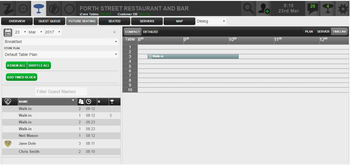 The Plan / Timeline buttons allow you to toggle between the traditional table plan view and the timeline view. The Timeline view allows the host to see an overview of the day ahead in terms of reservations and those already seated.