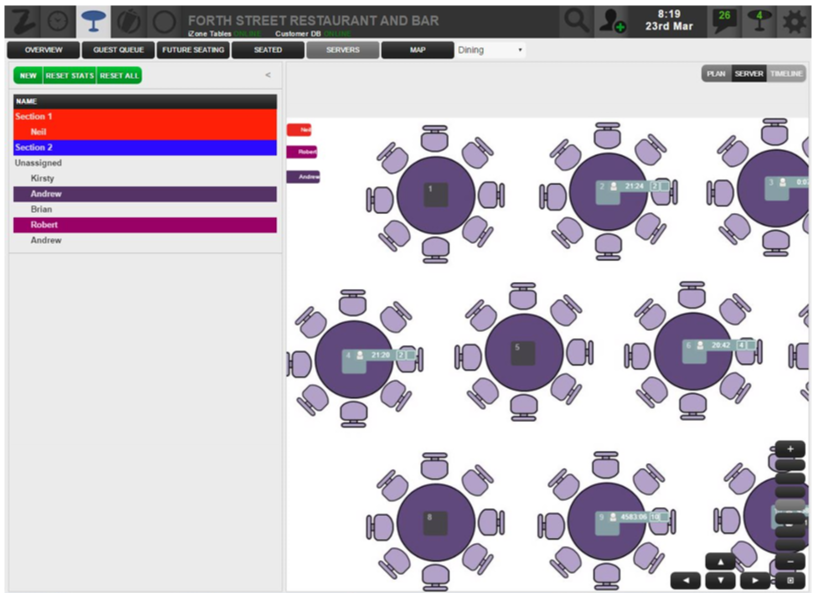 The Server button allows you to see which servers are attending to each table. In Server mode the tables are colour-coded corresponding with the server colours. If a table has seated guests, their status continues to be displayed on the table label.