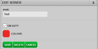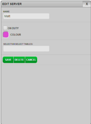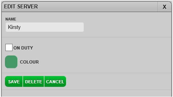 Select the COLOUR box to choose a colour to represent the server on the Table Plan.