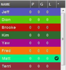 Servers who are on duty appear in coloured bars. Servers who are not on duty appear in grey. The * (asterisk) column is used to manually designate who the next server is to seat. By selecting the * column next to the server name, a checkmark is placed next to the server name in both the subtab and the map views.