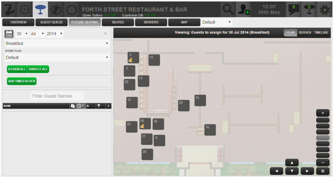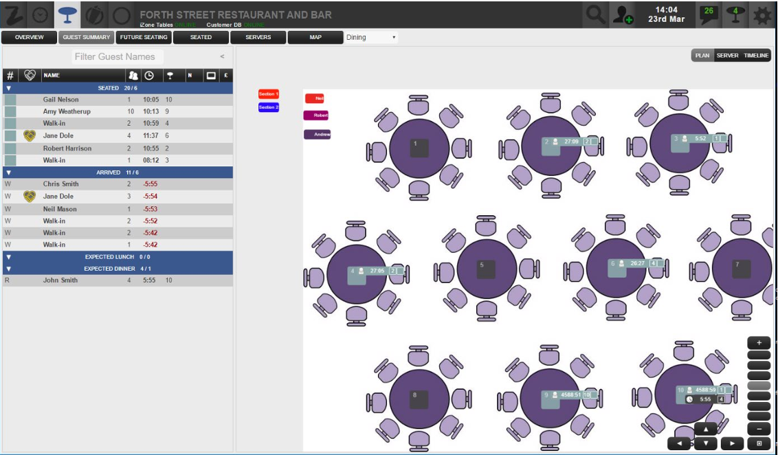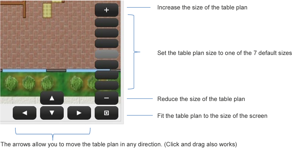 You can zoom in on the table plan to see more detail, using ‘pinch and zoom’ on mobile devices or the mouse wheel on PCs. Alternatively, the controls in the bottom right-hand corner of the window allow you to move the table plan and zoom in and out as required.