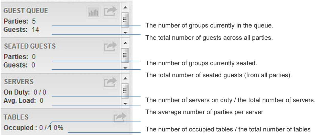 Overview: Lists the current number of customers waiting to be seated, currently seated, the number of servers on duty and the number of tables they are serving, and the number of tables and how many are occupied.