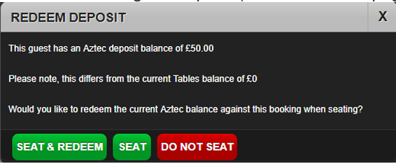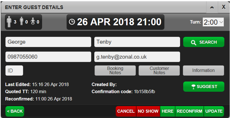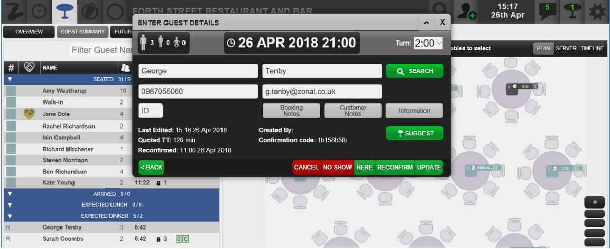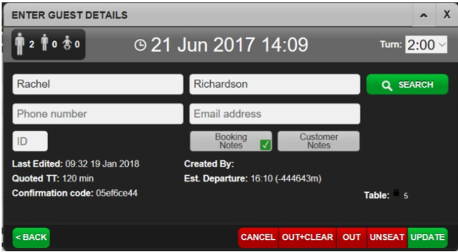 - Details about the customer’s booking are displayed in a black box. (e.g. booking type, arrival date/time and table number if any.)