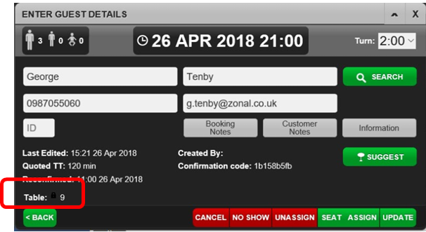 Tables does not re-assign a table to a guest when the cover count, date or time has been edited. Users must select Suggest to choose a new table.
