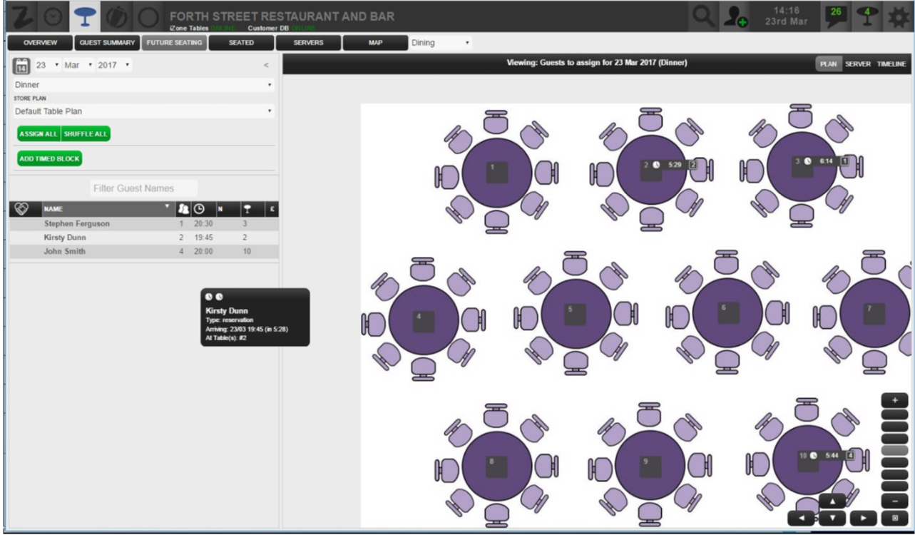 If reservations are assigned at the start of the day using the Assign All function, and additional reservations are made over the course of the day, table allocation may not be as effective as it could be. The Shuffle All function re-evaluates all assigned guests and redistributes bookings to maximise capacity.